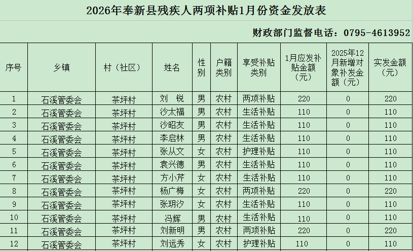 【殘疾補(bǔ)貼】2026年茶坪村殘疾人兩項(xiàng)補(bǔ)貼1月份資金發(fā)放表