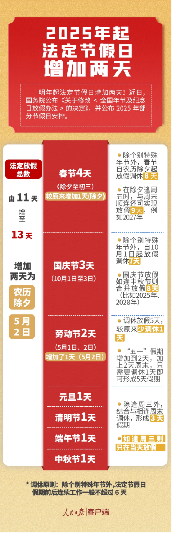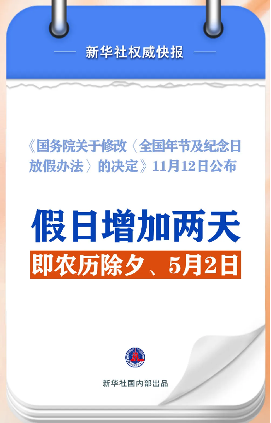 《國務院關于修改<全國年節及紀念日放假辦法>的決定》11月12日公布,自2025年1月1日起施行。決定規定,全體公民放假的假日增加2天,即農歷除夕、5月2日。全體公民放假的假日,可合理安排統一放假調休,結合落實帶薪年休假等制度,實際形成較長假期。除個別特殊情形外,法定節假日假期前后連續工作一般不超過6天。