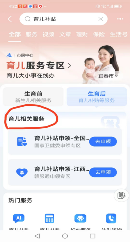 方法二:點(diǎn)擊手機(jī)上的支付寶,搜索“育兒補(bǔ)貼”,然后在育兒相關(guān)服務(wù)中去進(jìn)入“育兒補(bǔ)貼申領(lǐng)”。
