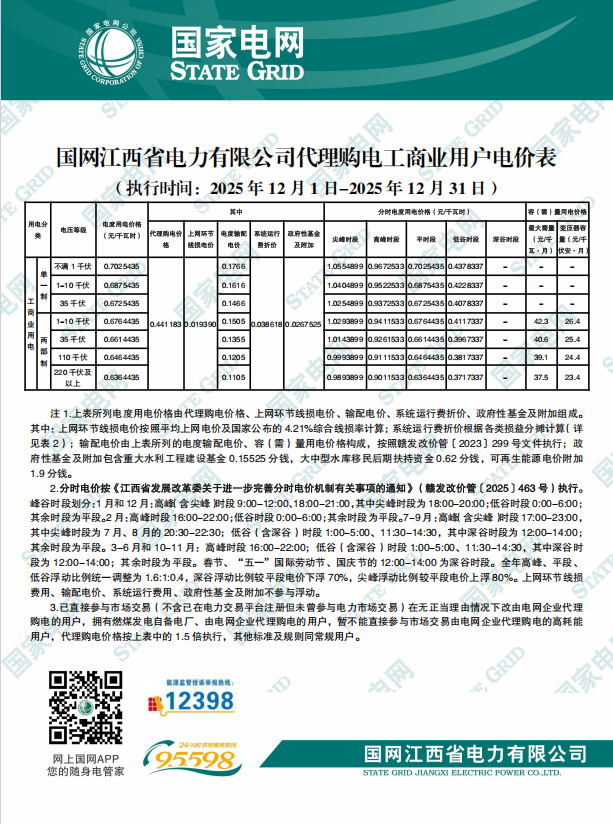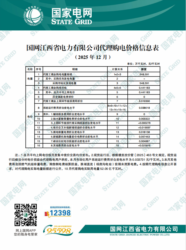 國網江西電力關于2025年12月代理工商業用戶購電價格的公告