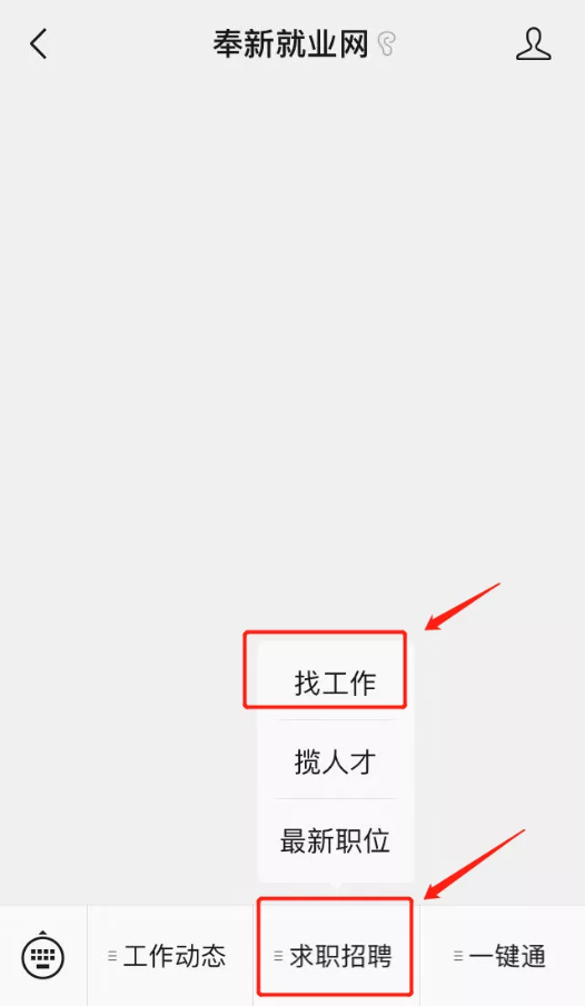 進入【奉新就業網】微信公眾號,點擊菜單【求職招聘】-【找工作】,進入奉新就業網,或者掃描下列二維碼進入。