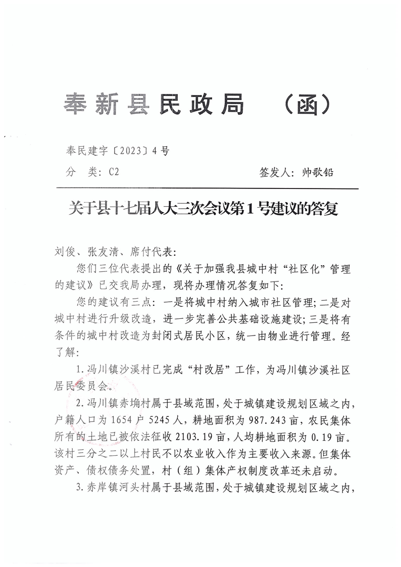 奉新縣民政局關(guān)于縣十七屆人大第三次會(huì)議第1號(hào)建議的答復(fù)