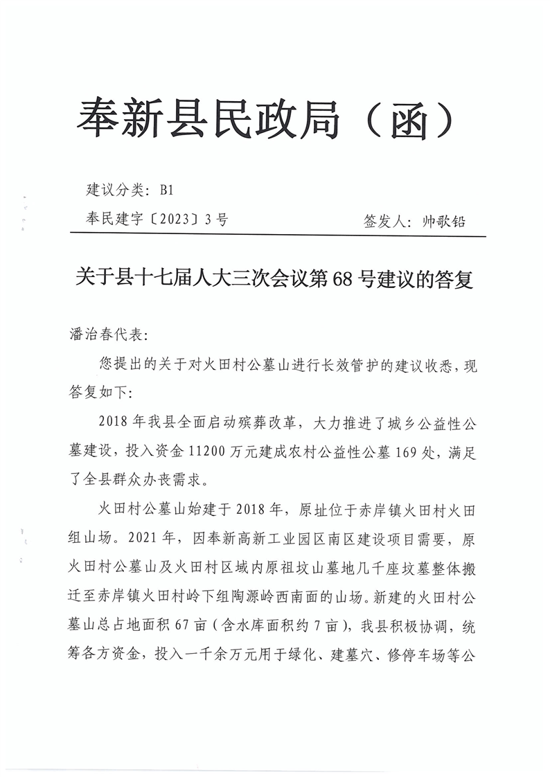 奉新縣民政局關(guān)于縣十七屆人大第三次會(huì)議第68號(hào)建議的答復(fù)