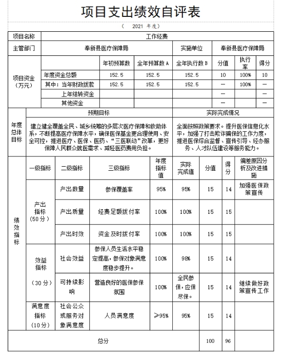 根據(jù)年初設(shè)定的績(jī)效目標(biāo),醫(yī)療保障工作經(jīng)費(fèi)項(xiàng)目績(jī)效自評(píng)得分為96分。項(xiàng)目全年預(yù)算數(shù)為152.5萬(wàn)元,執(zhí)行數(shù)為 152.5萬(wàn)元,完成預(yù)算的100%。項(xiàng)目績(jī)效目標(biāo)完成情況:一是資金管理:資金到位率100%,資金落實(shí)情況對(duì)項(xiàng)目實(shí)施的總體保障程度高,資金全部落實(shí),預(yù)算支出完成100%,全部按計(jì)劃完成,項(xiàng)目資金使用符合相關(guān)的財(cái)務(wù)管理制度規(guī)定,項(xiàng)目資金運(yùn)行情況規(guī)范;二是組織實(shí)施:項(xiàng)目實(shí)施單位的財(cái)務(wù)制度健全,財(cái)務(wù)管理制度規(guī)范,對(duì)安全運(yùn)行提供了可靠保障,業(yè)務(wù)管理制度有效執(zhí)行;三是產(chǎn)出數(shù)量:2021年工作經(jīng)費(fèi)完成率100%;四是產(chǎn)出質(zhì)量:質(zhì)量達(dá)標(biāo)率100%,定時(shí)定質(zhì)定量按時(shí)完成。目前未發(fā)現(xiàn)偏離績(jī)效目標(biāo)現(xiàn)象,績(jī)效自評(píng)結(jié)果應(yīng)用到工作中,繼續(xù)按照文件要求做好績(jī)效評(píng)價(jià)工作。