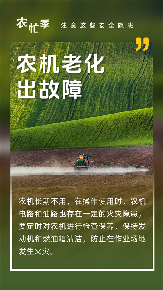 · 全面檢查維護:農機使用前,要對拖拉機、播種機、收割機等設備進行全面檢查和維護,確保零部件齊全、性能良好,剎車、轉向、燈光等安全裝置靈敏可靠。