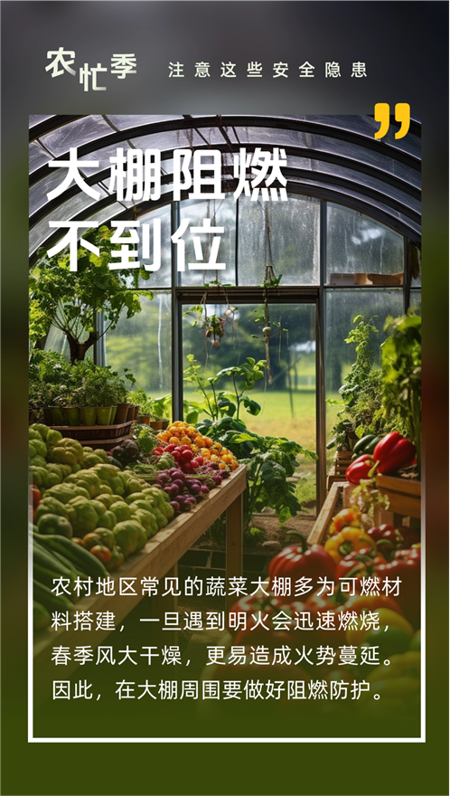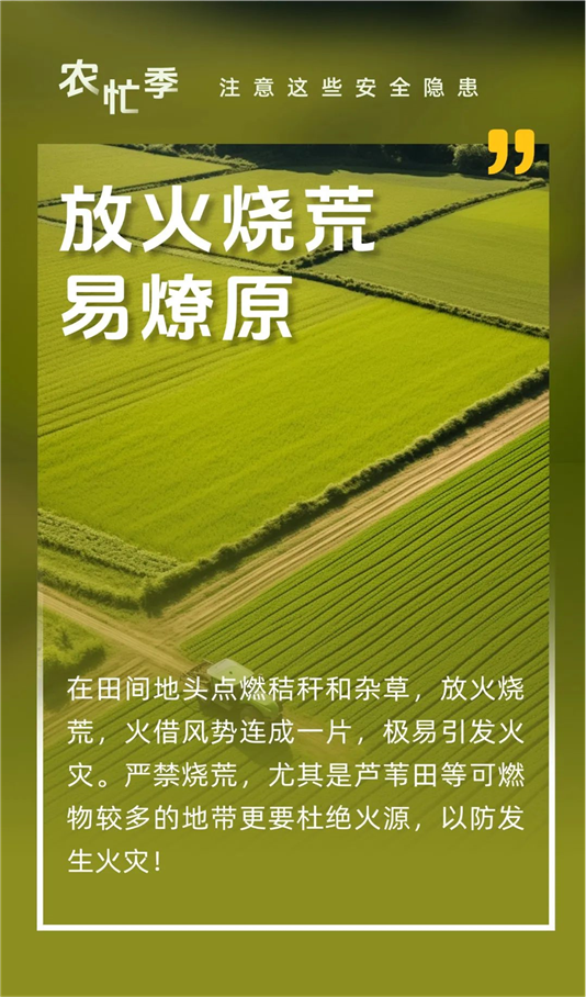 · (3)制止兒童玩火。春耕開始后,有些小孩偷偷到田間地頭玩火,由于天干物燥,如果遇到大量可燃物,極易引發火災。在此提醒各位農戶,要加強對孩子的教育監管,教育孩子不玩火。