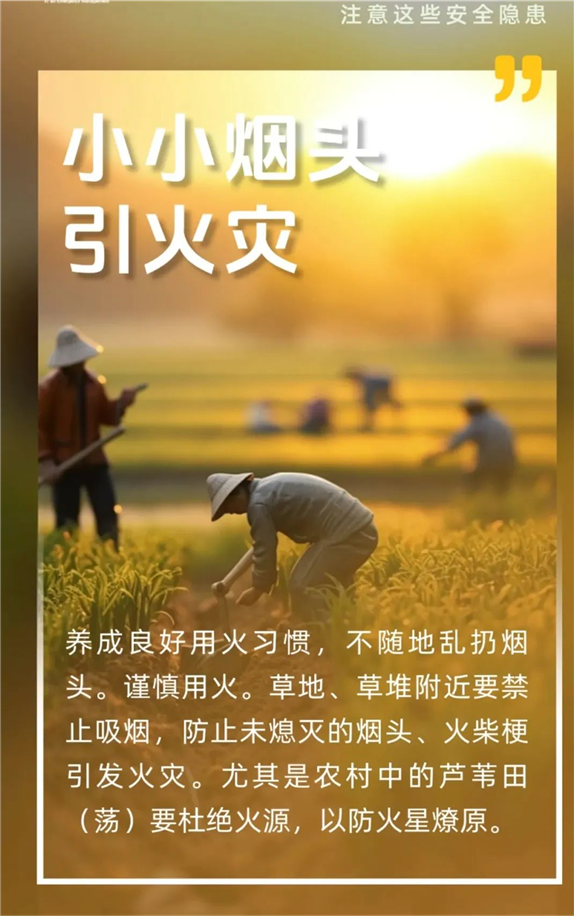 · (2)杜絕亂扔煙頭。田間地頭農忙時,不要隨意將煙頭或點煙過后的火柴亂扔,以防接觸到干草堆和枯葉引發火災,努力養成良好的用火習慣,野外不吸煙、不亂扔煙頭。