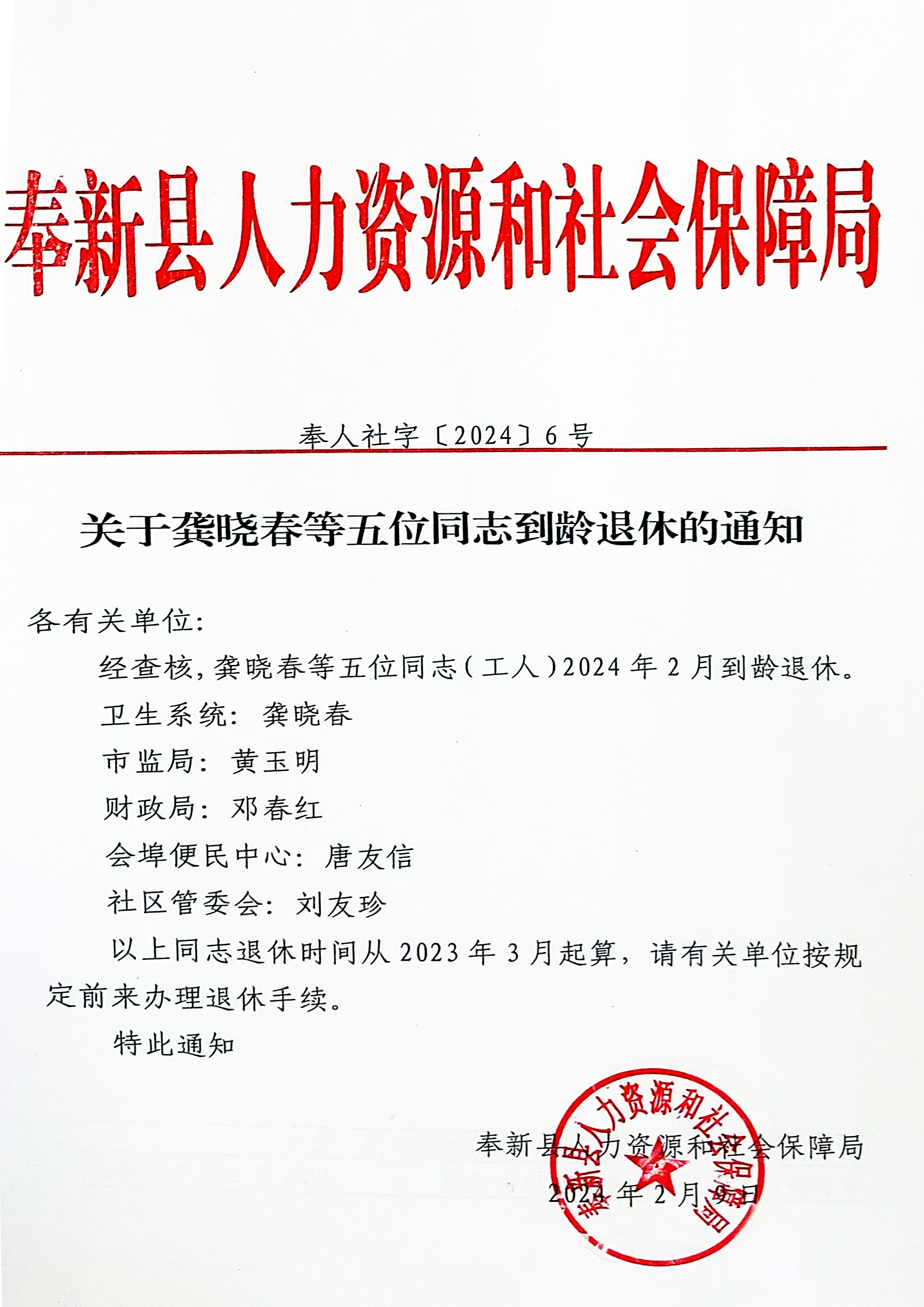 馮川鎮:關于鄧春紅同志到齡退休的通知