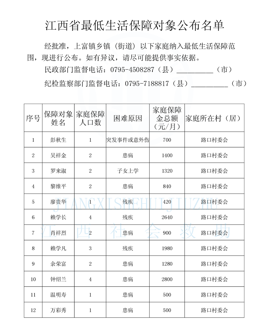 【社會救助】2025年10月份上富鎮農村低保發放標準和名單