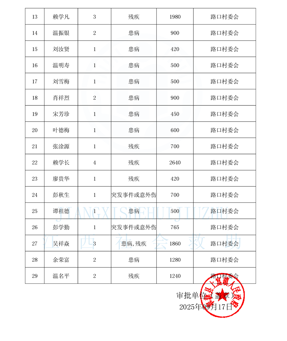 【社會救助】2025年9月份上富鎮農村低保發放標準和名單