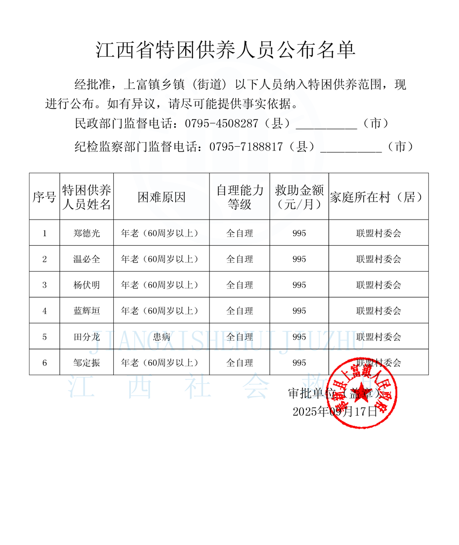 【社會救助】2025年9月份上富鎮特困供養人員供養金發放表
