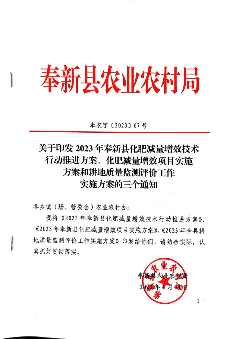 關于印發(fā)2023年奉新縣化肥減量增效技術行動推進方案、化肥減量增效項目實施方案和耕地質(zhì)量監(jiān)測評價工作實施方案的三個通知