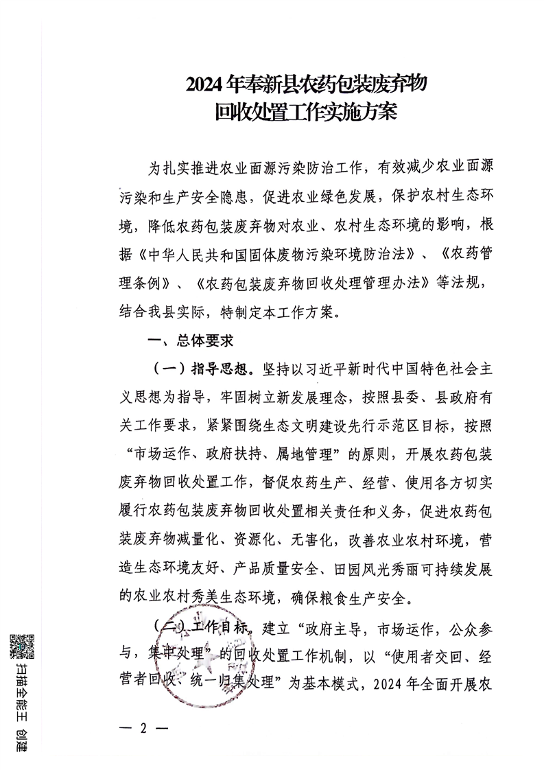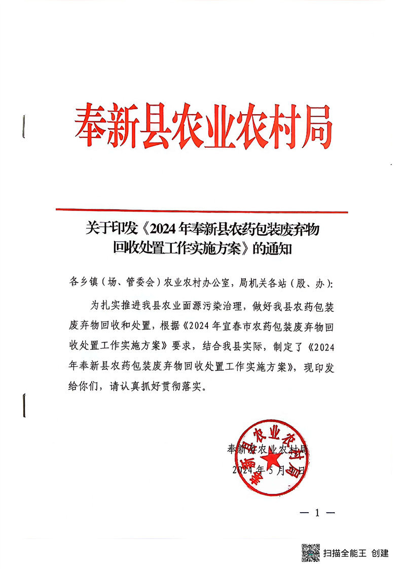 關(guān)于印發(fā)《2024年奉新縣農(nóng)藥包裝廢棄物回收處置工作實施方案》的通知