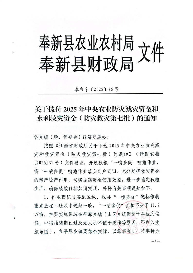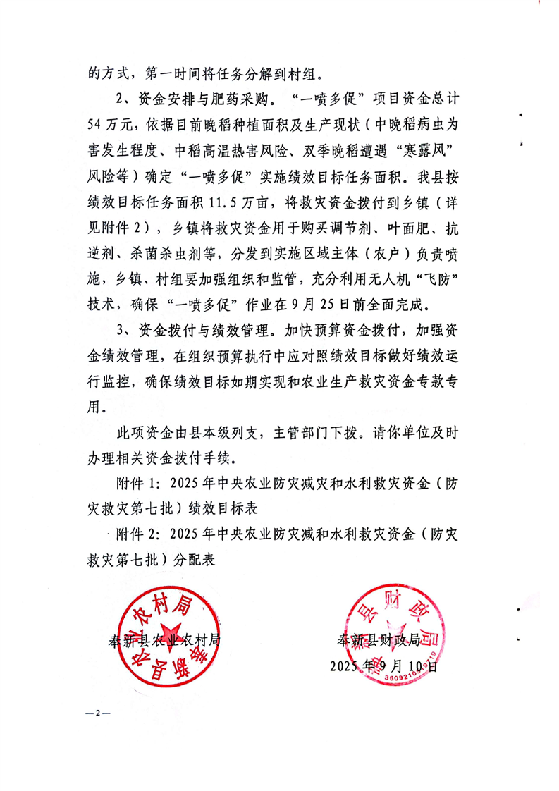 關于撥付2025年中央農業生產防災減災資金和水利救災資金(防災救災第七批)的通知(一噴多促)