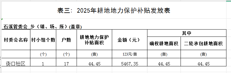 【耕地補貼】石溪管委會街口社區2025年耕地地力保護補貼發放表