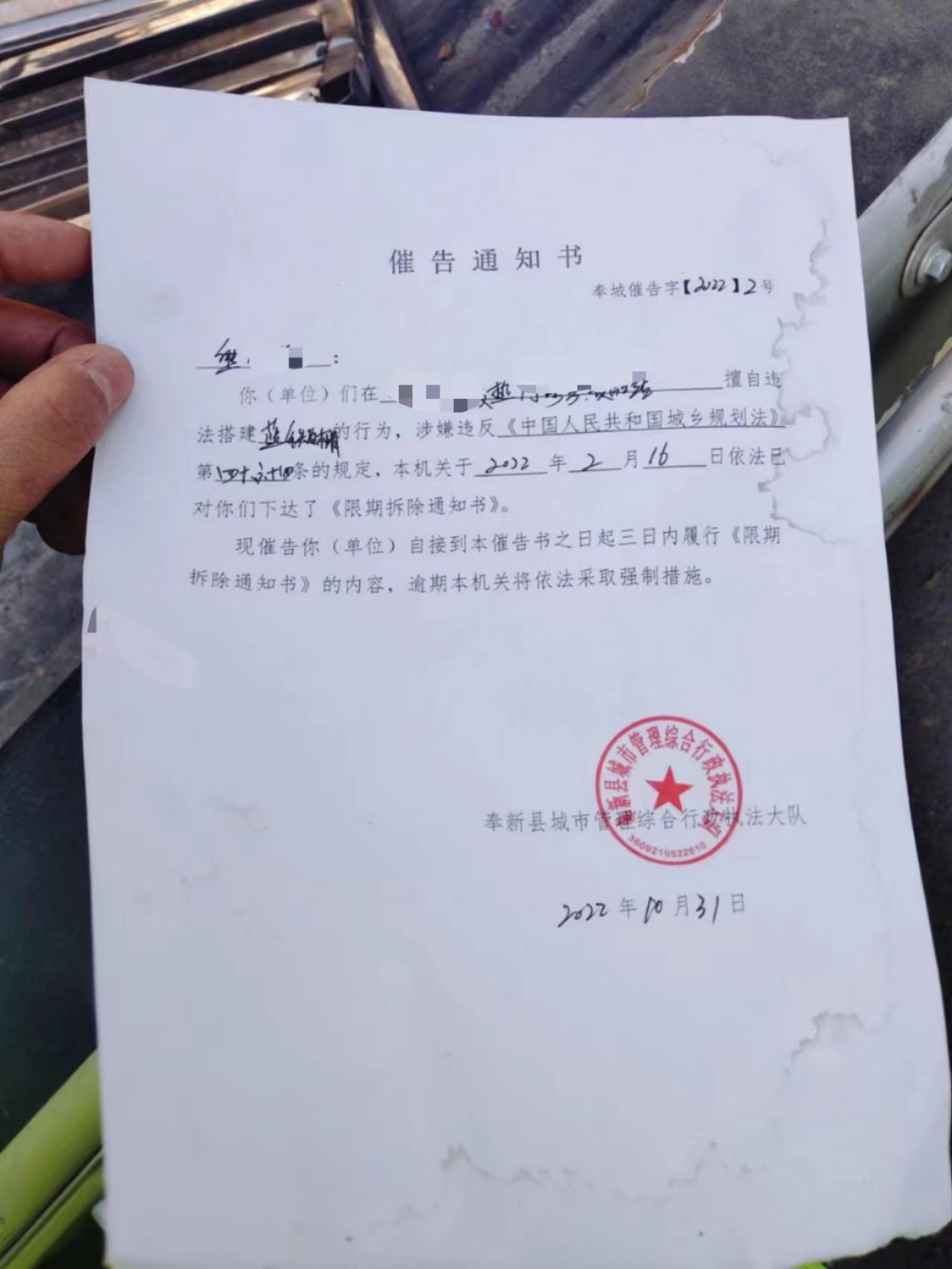 馮川鎮:催告通知單