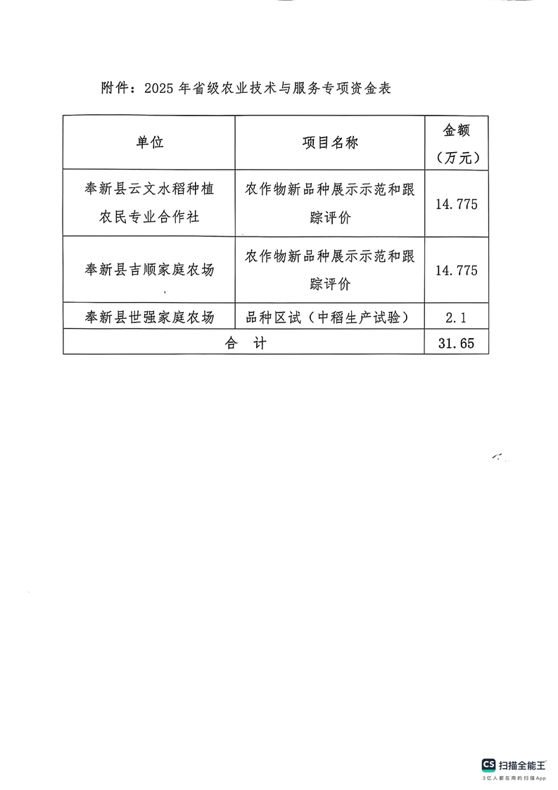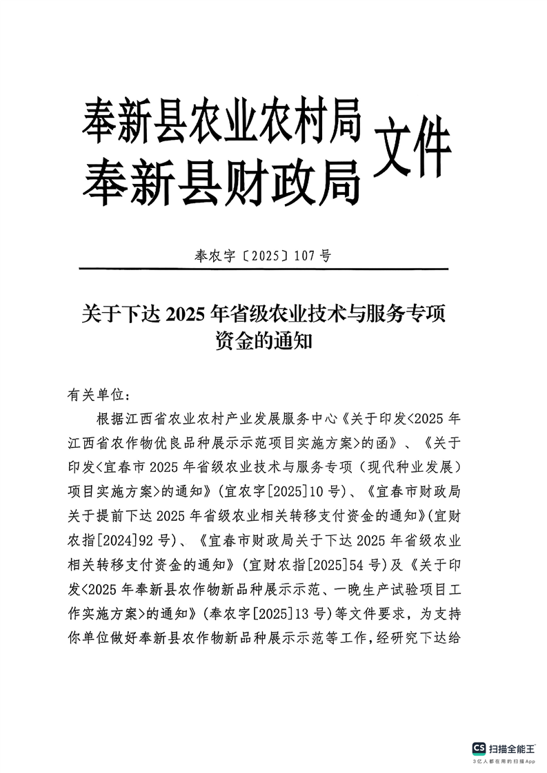 關于下達2025年省級農業技術與服務專項資金的通知(奉農字【2025】107號)