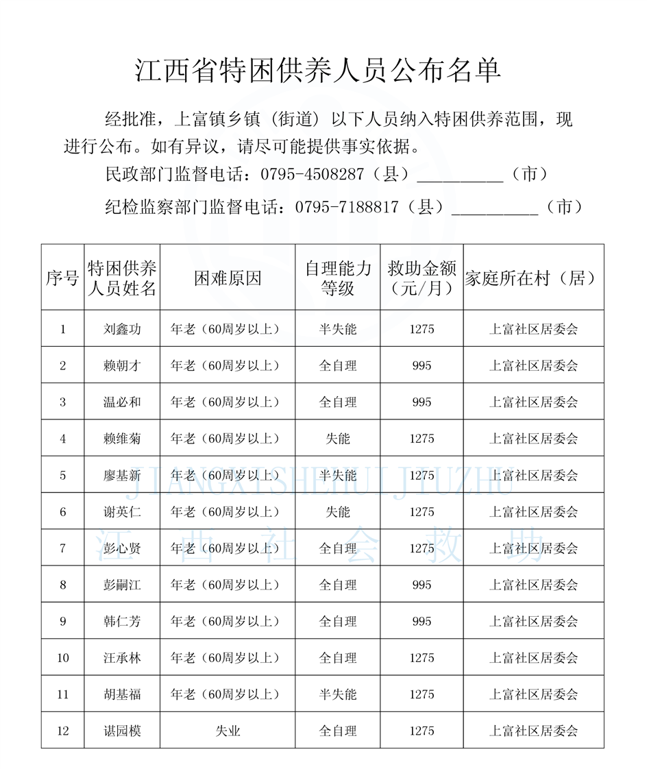 【社會救助】2025年10月份上富鎮特困供養人員供養金發放表