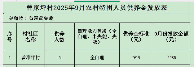 曾家坪村2025年9月農(nóng)村特困人員供養(yǎng)金發(fā)放表