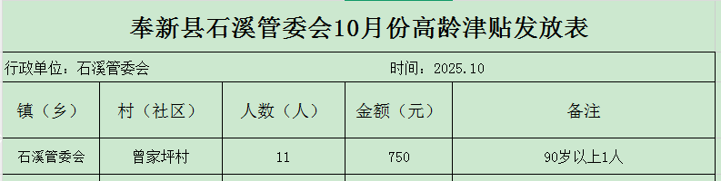 【高齡津貼】奉新縣石溪管委會曾家坪村2025年10月份高齡津貼發放表