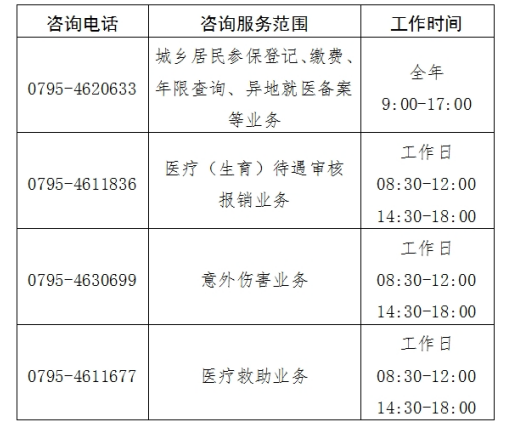 如您還需了解更多基本醫療保險服務相關內容,請聯系奉新縣醫療保障局辦公室:0795-4611639,或根據咨詢服務范圍撥打以下電話: