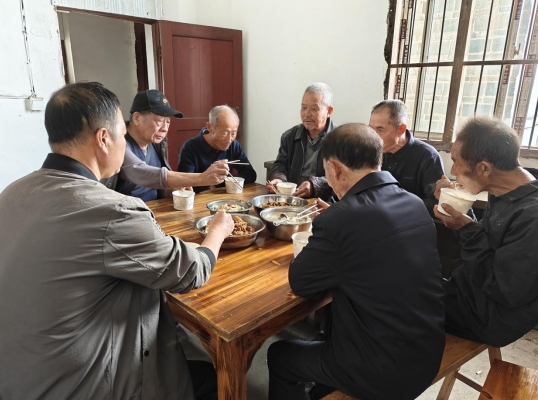 座談會的暖意尚未消散,村委會食堂已飄來飯菜的香氣,隨著熱騰騰的飯菜出鍋,一場溫馨的“團圓宴”正悄然拉開帷幕。餐桌上,村干部們送上節日的祝福,老人們圍坐在桌旁,熟悉的鄉音此起彼伏,有的聊著村里的新變化,有的回憶年輕時共事的趣事,一片歡聲笑語中,流淌著濃濃的溫情與喜悅。