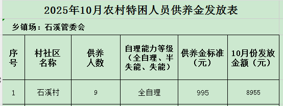石溪村2025年10月農村特困人員供養金發放表