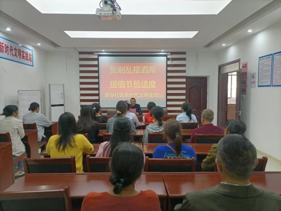活動當天,新吳社區借助講座的形式向居民們詳細介紹了亂擺酒席的危害以及移風易俗的重要性。講座內容涵蓋了酒席浪費的現狀、經濟和社會影響等方面,引發了居民們對于亂擺酒席問題的深思。