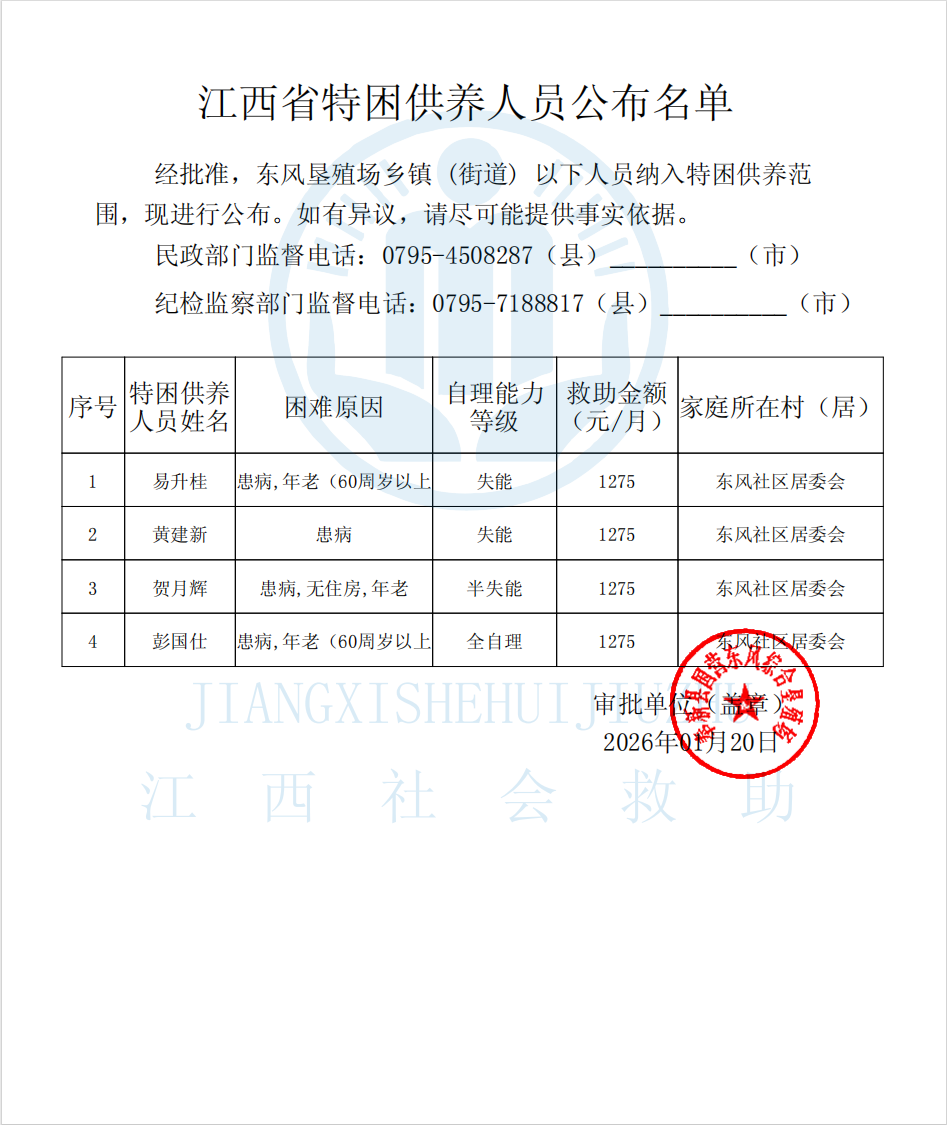 東風社區2026年1月份特困供養人員公布名單