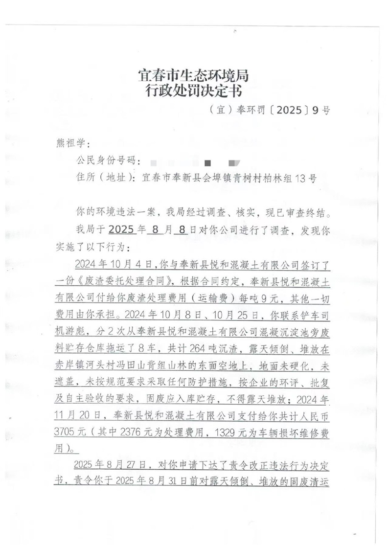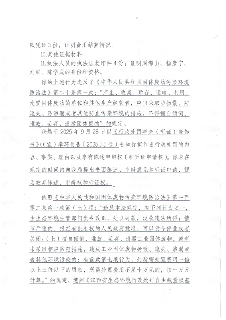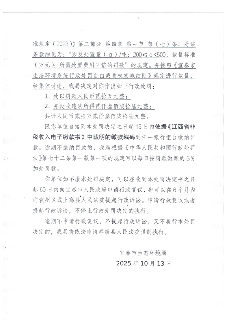 宜春市生態環境局行政處罰決定書