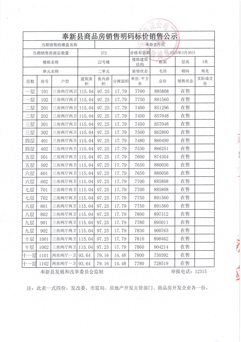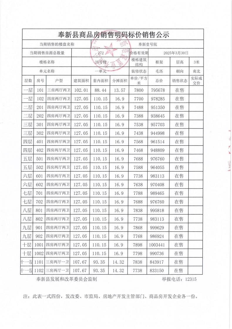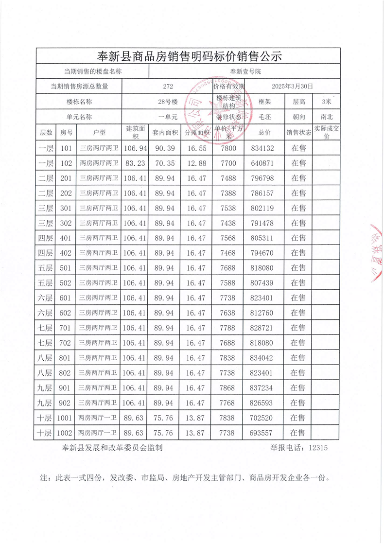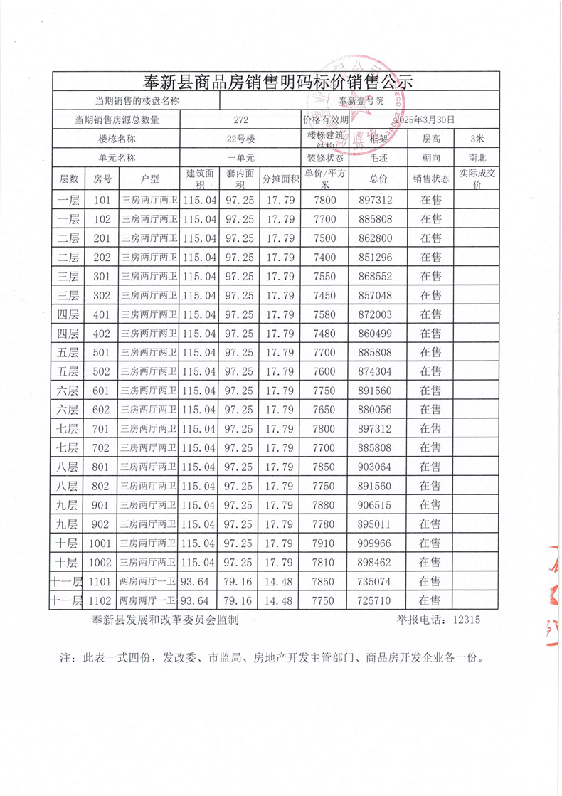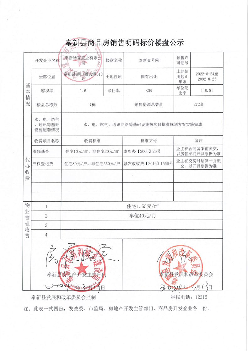 奉新壹號院19#、20#、21#、22#、25#、26#、28#號樓預售許可證和銷售價格公示