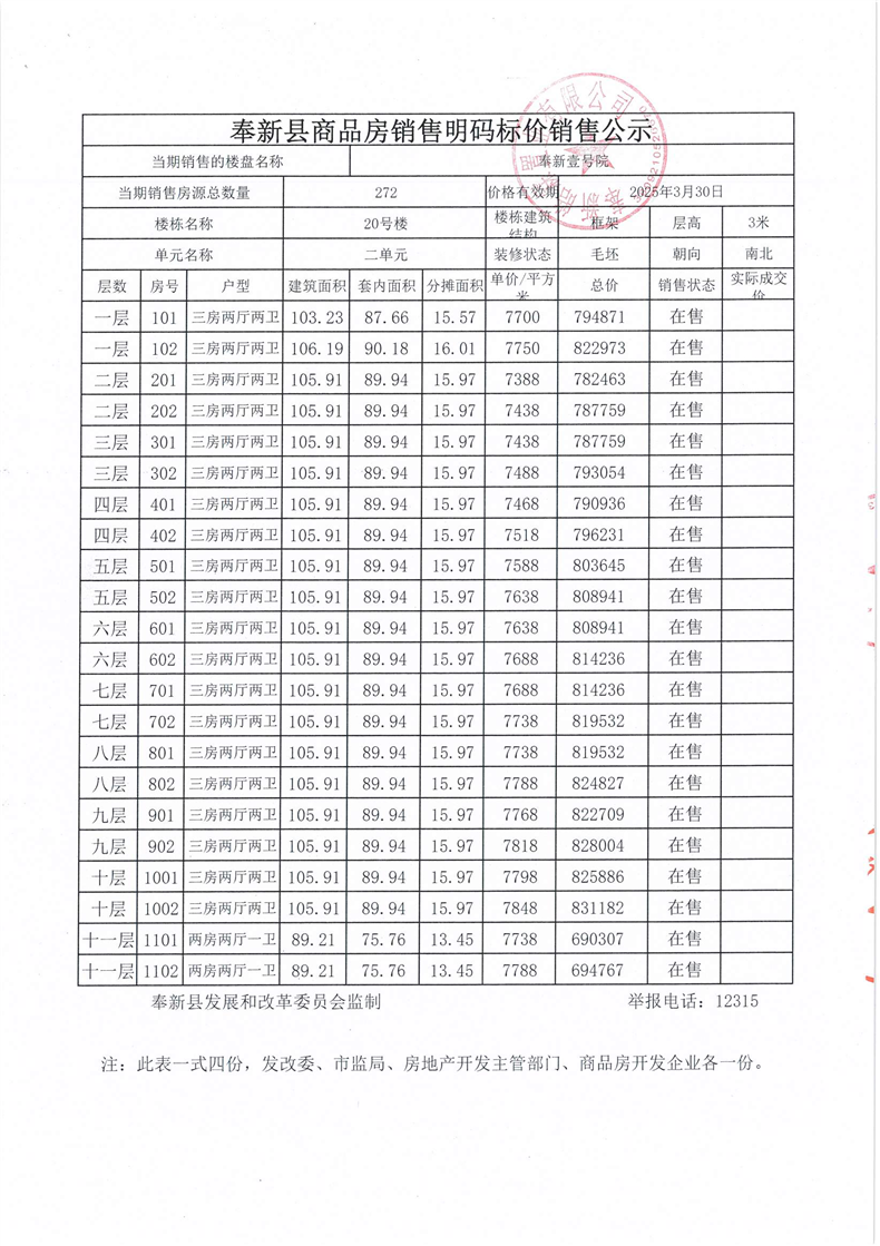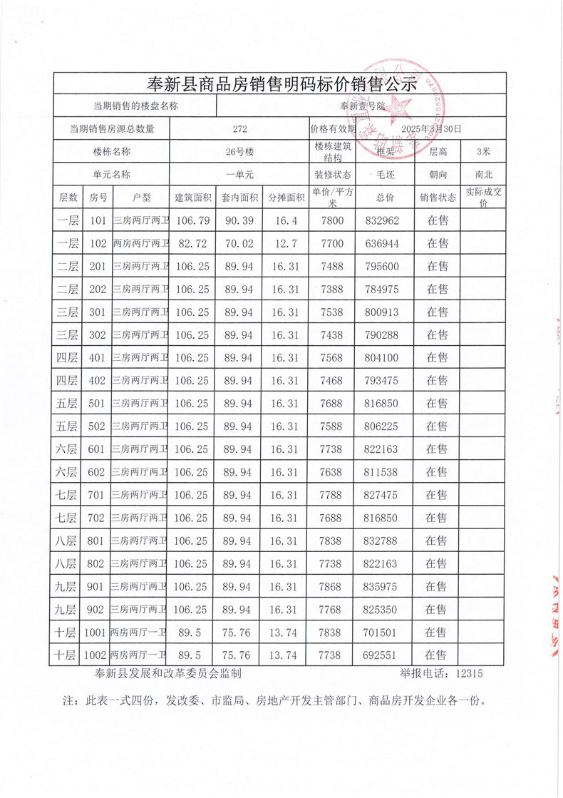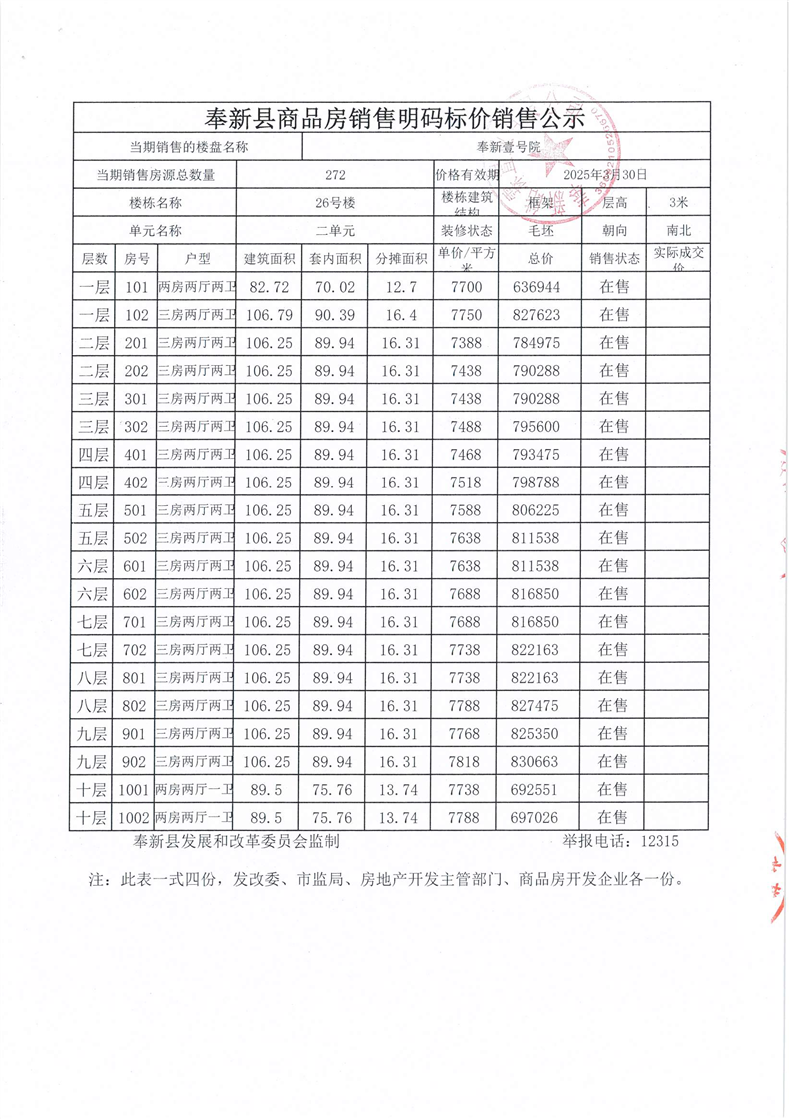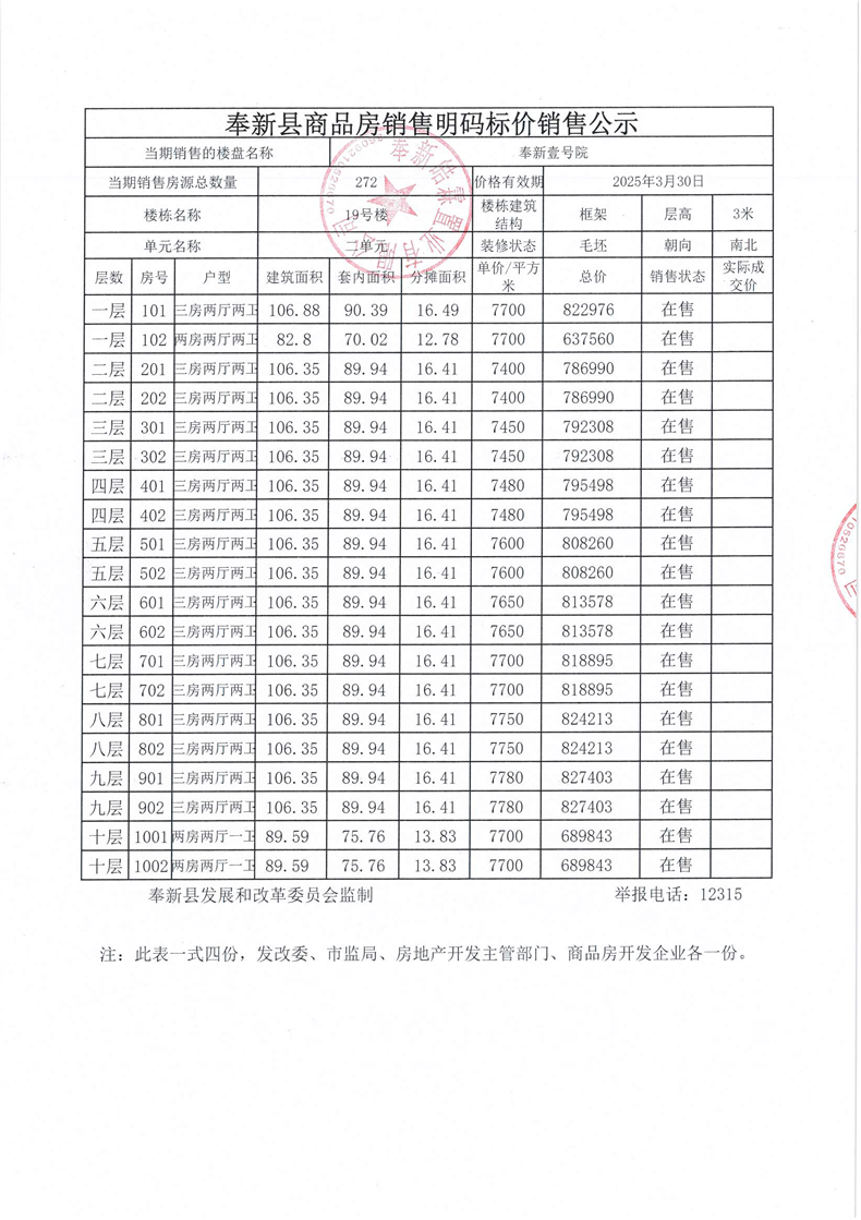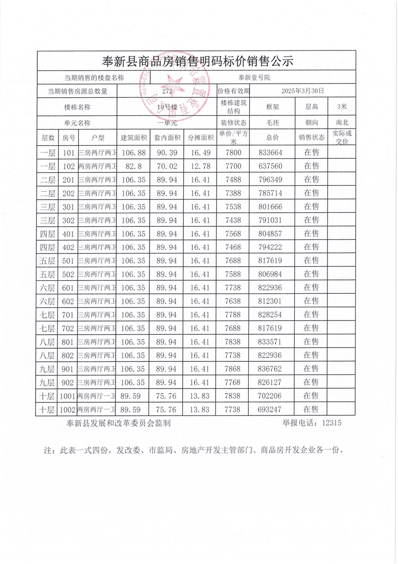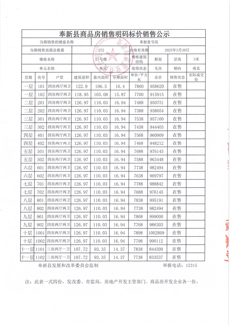 奉新壹號院19#、20#、21#、22#、25#、26#、28#號樓預售許可證和銷售價格公示
