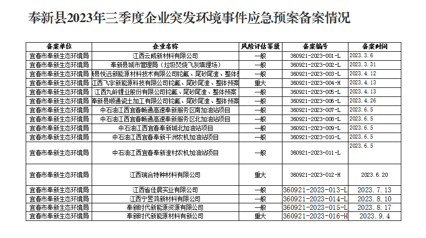 奉新縣2023年三季度企業(yè)突發(fā)環(huán)境事件應(yīng)急預(yù)案?jìng)浒盖闆r