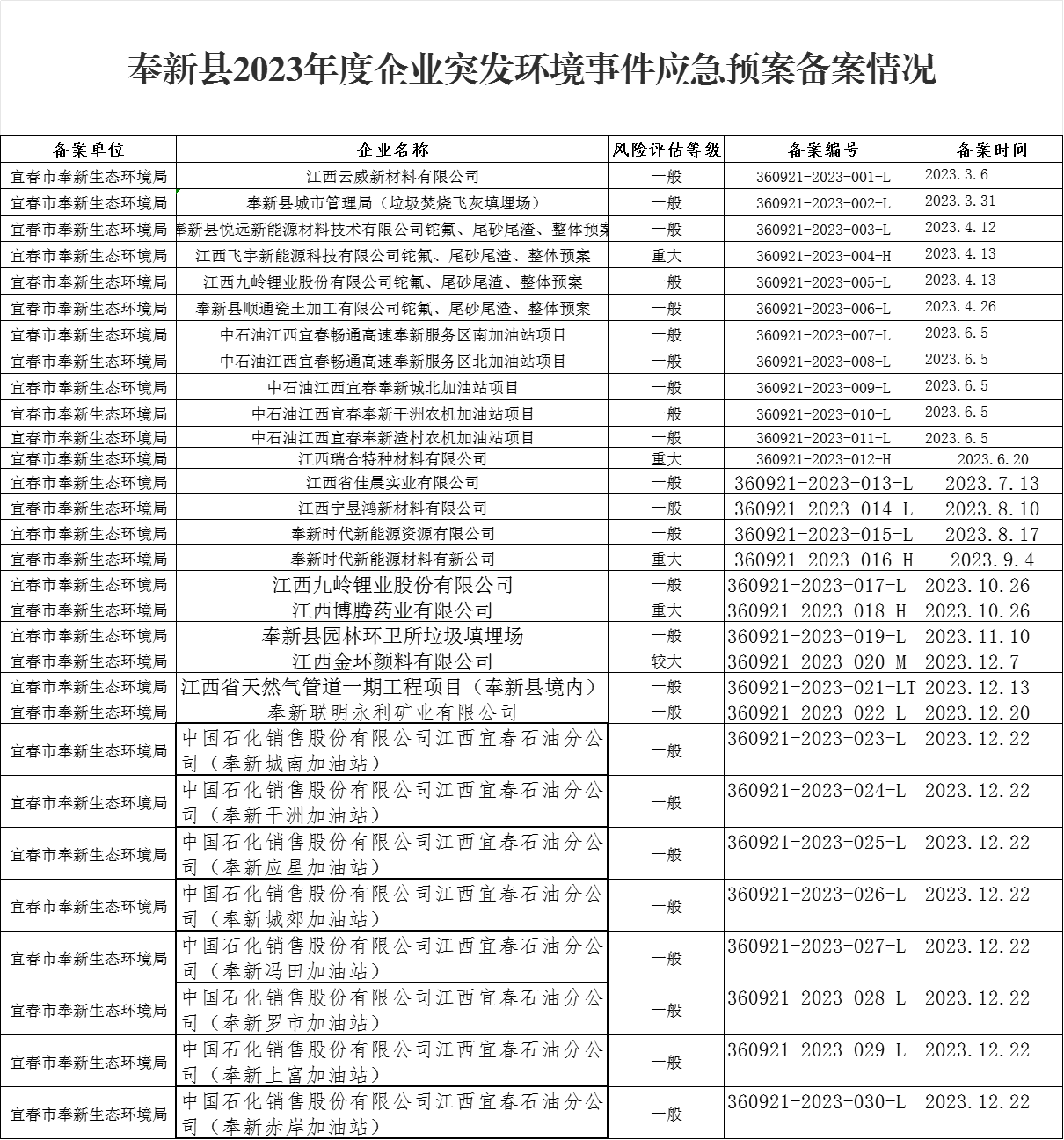 奉新縣2023年度企業突發環境事件應急預案備案情況