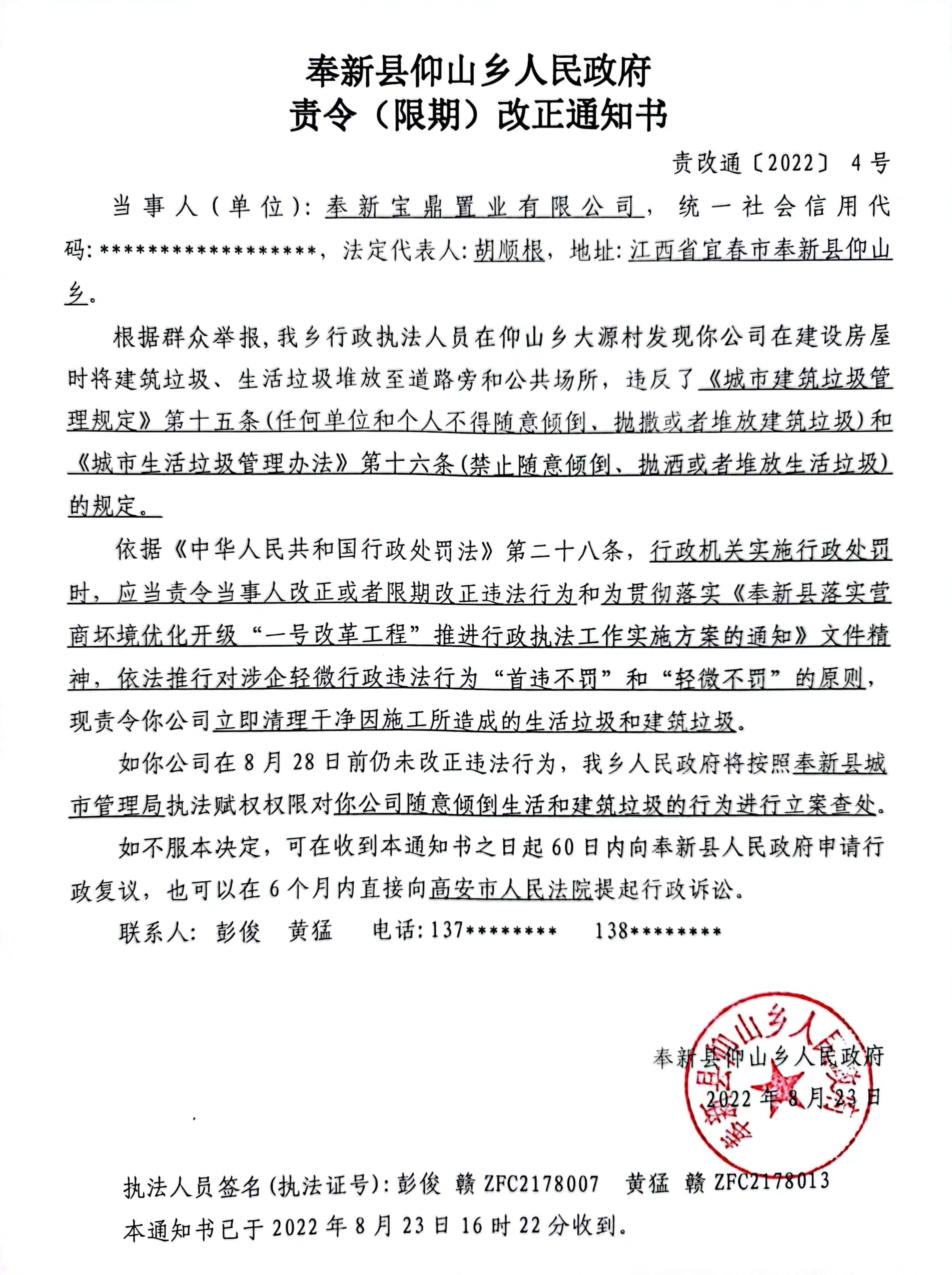 仰山鄉(xiāng):責(zé)令(限期)改正通知書 責(zé)改通〔2022〕4號