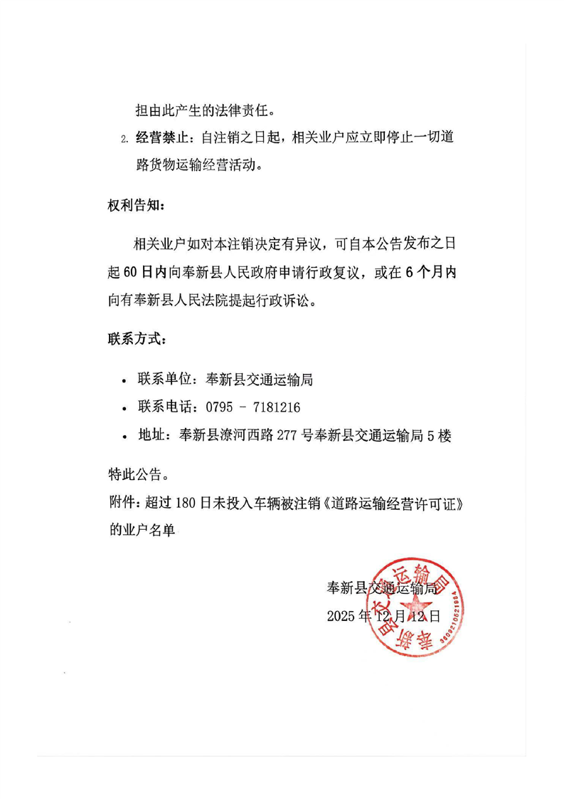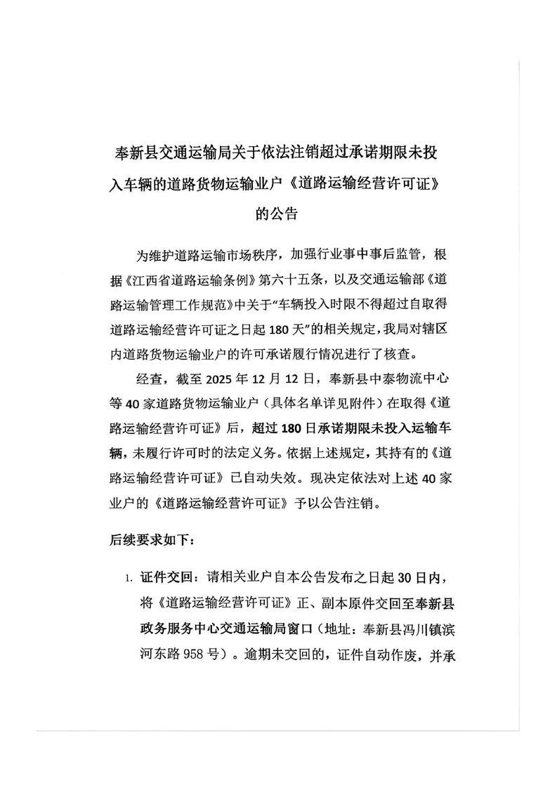 奉新縣交通運(yùn)輸局關(guān)于依法注銷超過承諾期限未投入車輛的道路貨物運(yùn)輸業(yè)戶