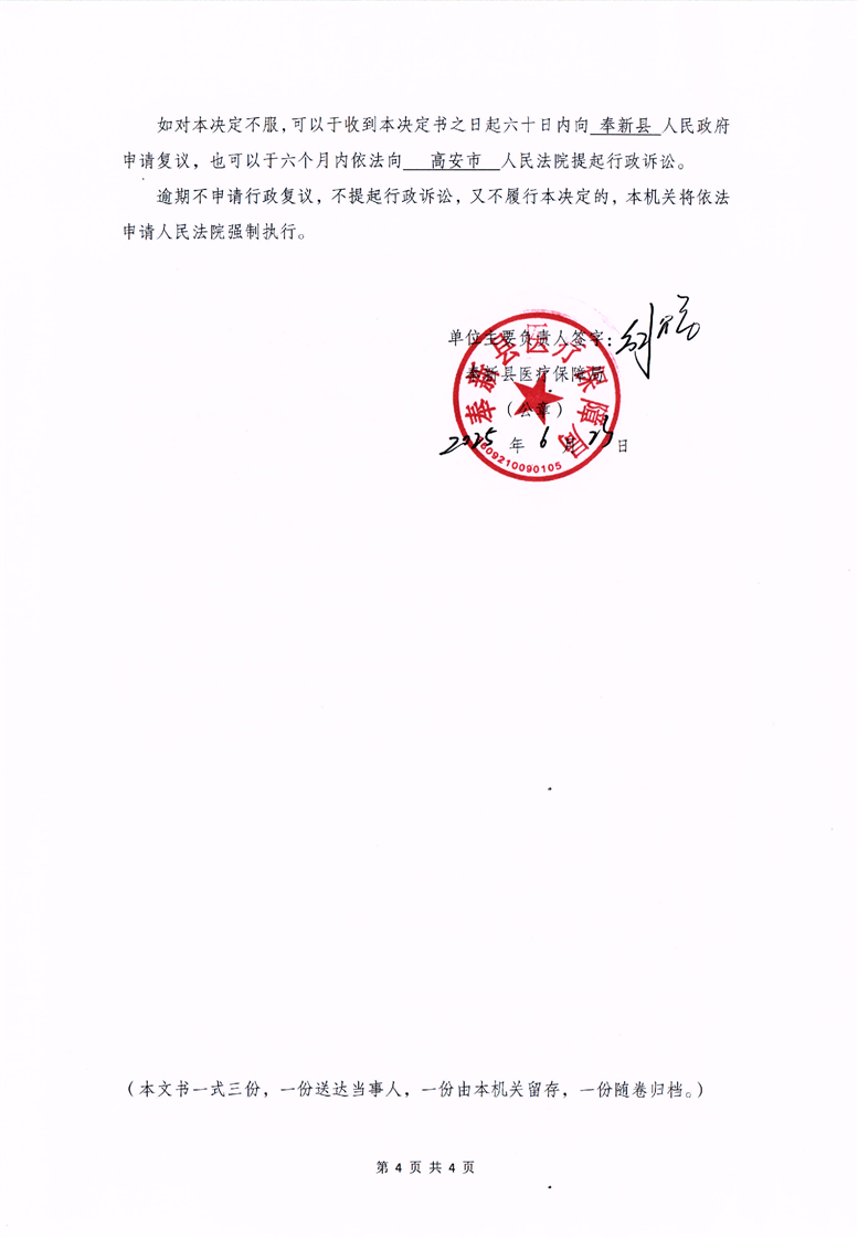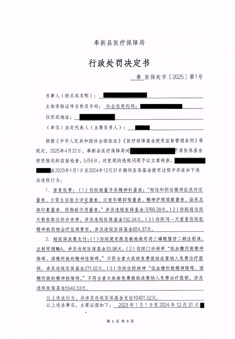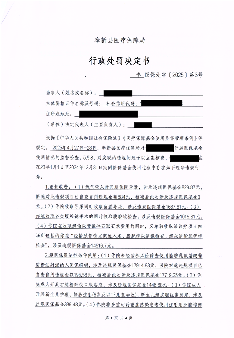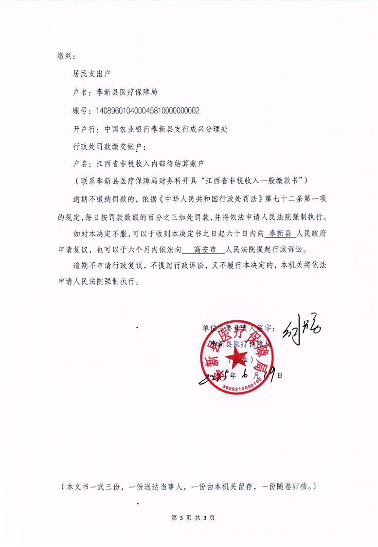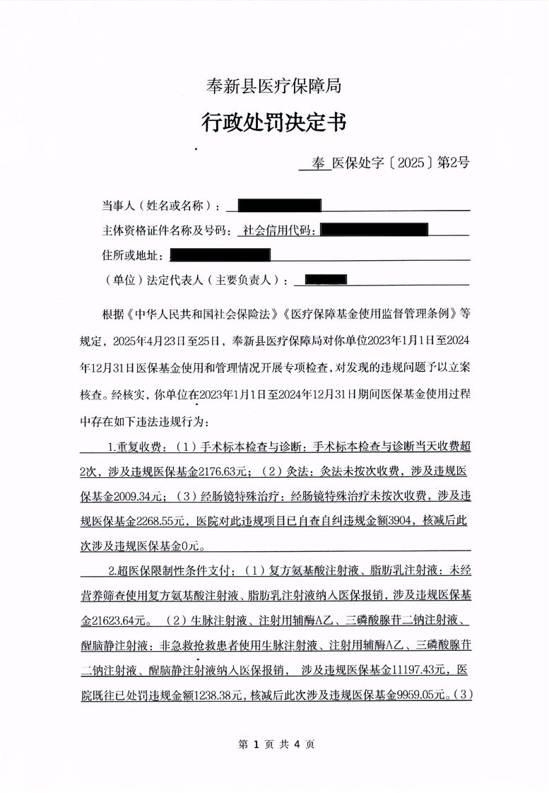 奉新縣醫(yī)療保障局行政處罰決定書
