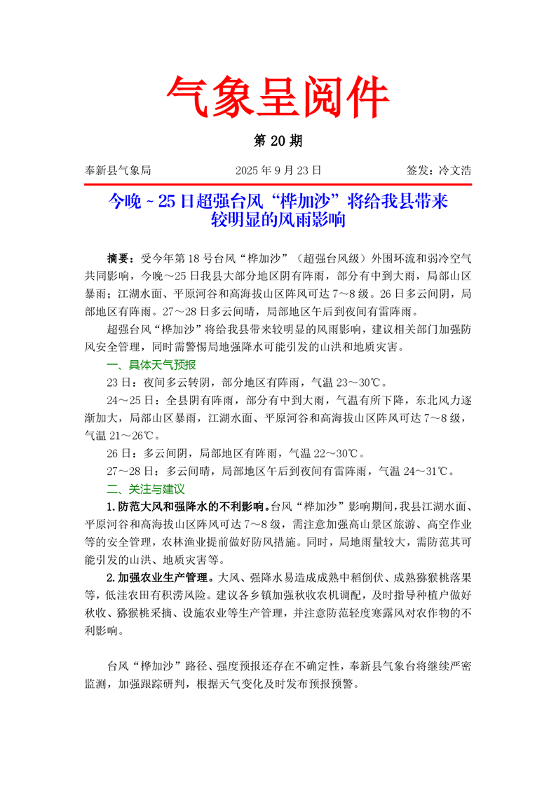 2025年氣象呈閱件第20期(今晚~25日超強(qiáng)臺(tái)風(fēng)“樺加沙”將給我縣帶來較明顯的風(fēng)雨影響)