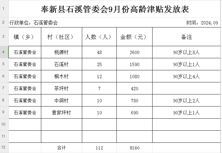 奉新縣石溪管委會2024年9月份高齡津貼發放表