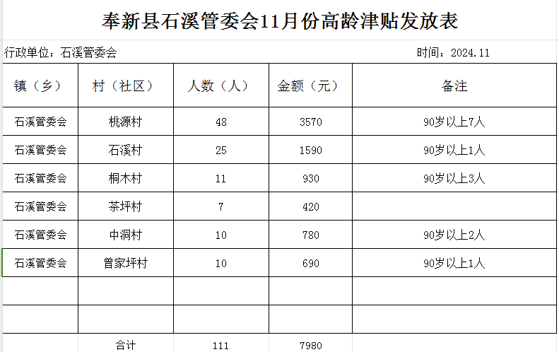奉新縣石溪管委會(huì)2024年11月高齡津貼發(fā)放表