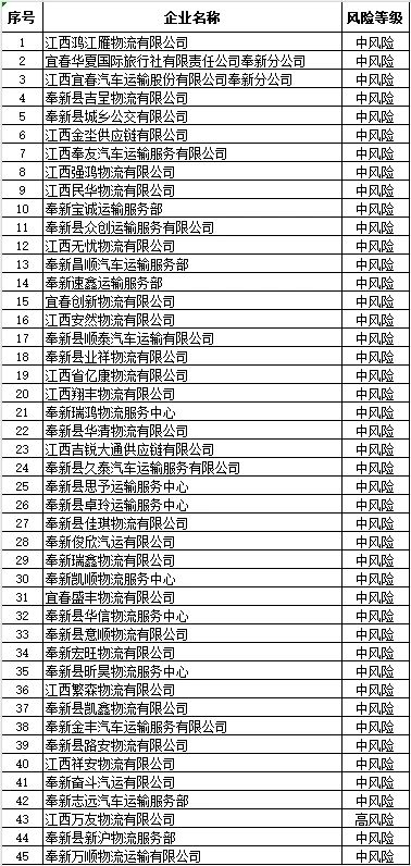 奉新縣共計(jì)45家道路運(yùn)輸企業(yè)被評(píng)估為中、高風(fēng)險(xiǎn)企業(yè),以上為全部?jī)?nèi)容。
