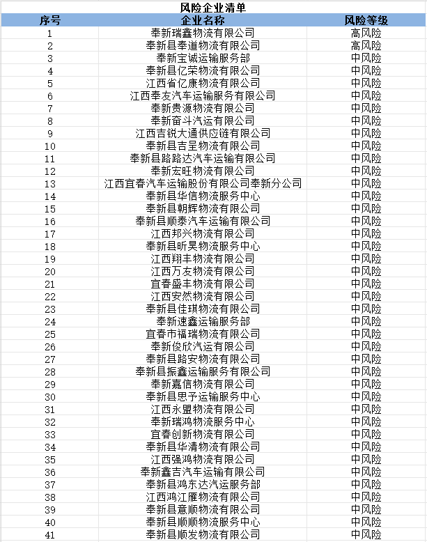 奉新縣共計(jì)41家道路運(yùn)輸企業(yè)被評估為中、高風(fēng)險(xiǎn)企業(yè),以上為全部內(nèi)容。