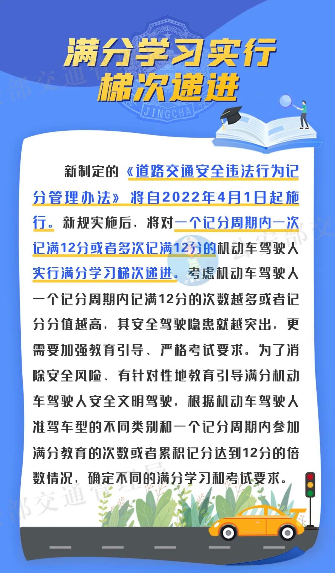 新制定的《道路交通安全違法行為記分管理辦法》將自2022年4月1日起施行。新規實施后,將對一個記分周期內一次記滿12分或者多次記滿12分的機動車駕駛人實行滿分學習梯次遞進。