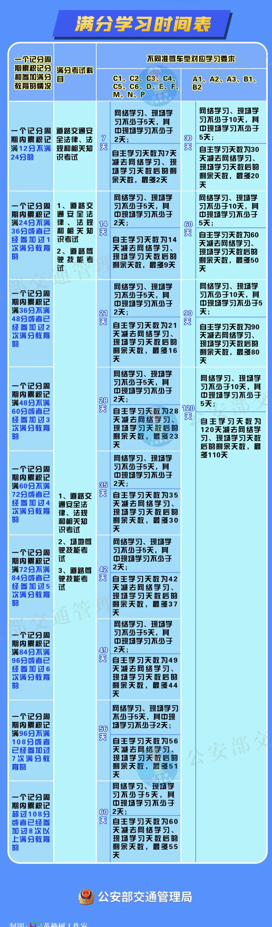 考慮機動車駕駛人一個記分周期內記滿12分的次數越多或者記分分值越高,其安全駕駛隱患就越突出,更需要加強教育引導、嚴格考試要求。為了消除安全風險、有針對性地教育引導滿分機動車駕駛人安全文明駕駛,根據機動車駕駛人準駕車型的不同類別和一個記分周期內參加滿分教育的次數或者累積記分達到12分的倍數情況,確定不同的滿分學習和考試要求。