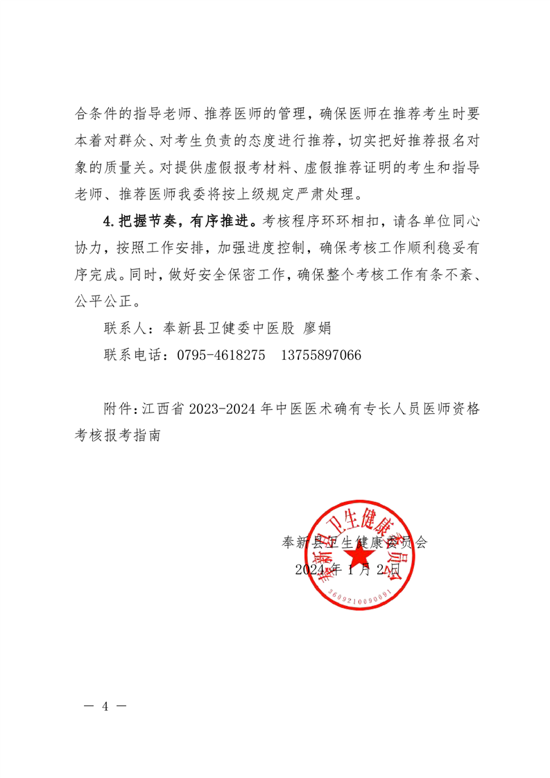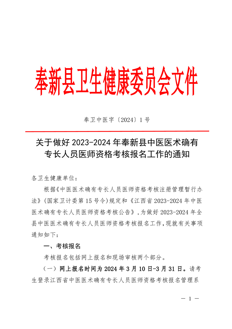 【文件有效】奉衛中醫字〔2024〕1號關于做好2023-2024年奉新縣中醫醫術確有專長人員醫師資格考核報名工作的通知
